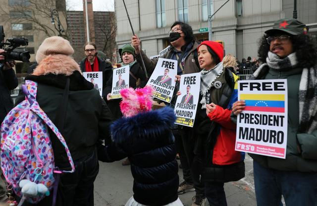 就在马杜罗出庭的纽约南区联邦地区法院外,大量的抗议者已经在此集结,反对美国政府的暴行,对委内瑞拉和马杜罗发出声援。